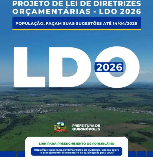 A Lei de Diretrizes Orçamentárias (LDO) 2026 está em fase de elaboração, e sua opinião é essencial! 9 de abril de 202559FacebookTwitterPinterestWhatsApp Envie suas sugestões até o dia 14 de abril de 2025 e ajude a definir as prioridades para o próximo ano.Participe e faça a diferença!Relacionadohttps://www.youtube.com/watch?v=puYNnoqI4AE&t=22s