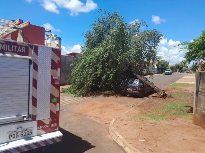 Era pouco antes das 11h da manhã de ontem (20), quando o Corpo de Bombeiros foi chamado à Rua 7 do Conjunto Eldorado, onde uma árvore havia caído sobre um Fiat Uno, o que deixou a via interditada.