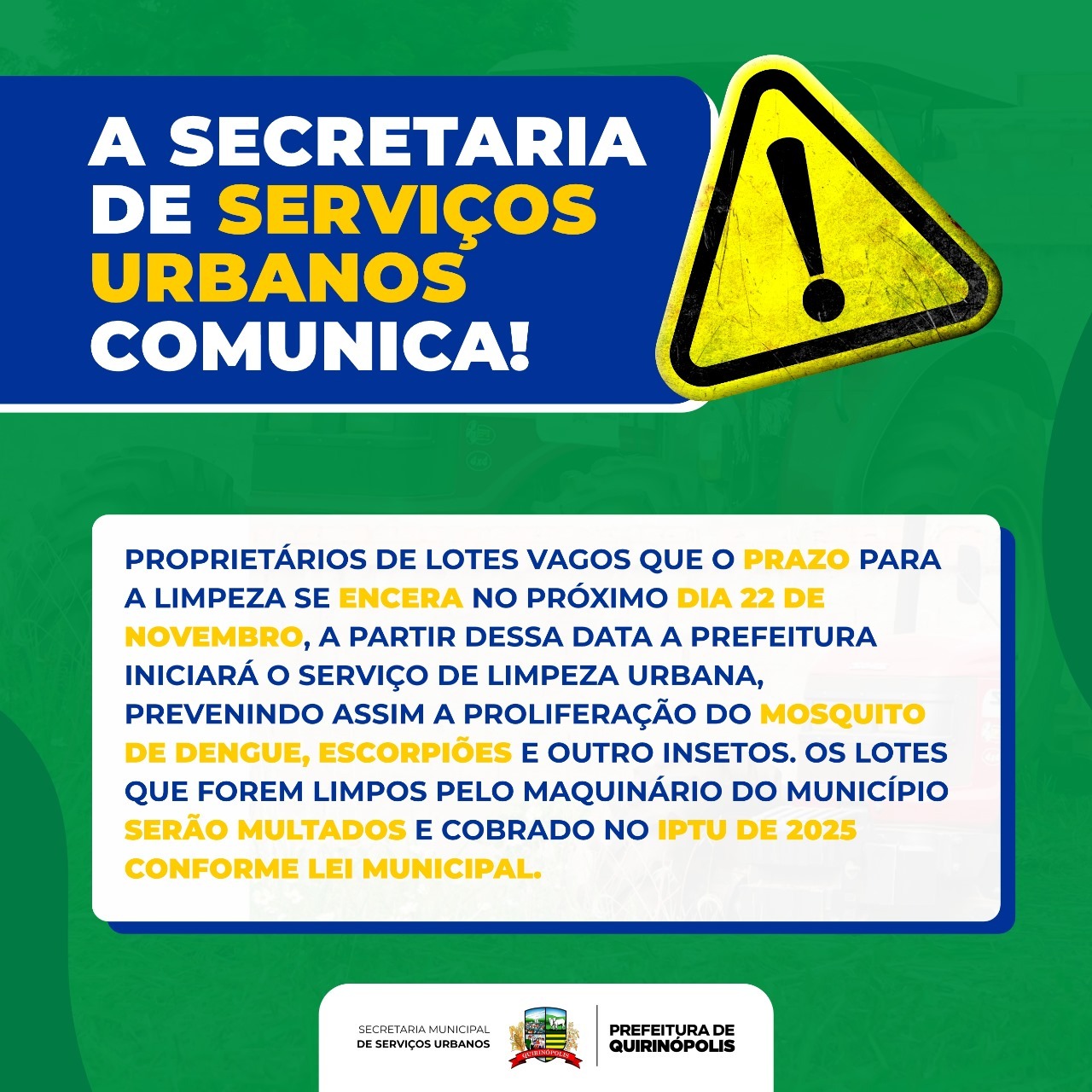 Atenção para esse comunicado sobre a limpeza dos lotes baldios em Quirinópolis.