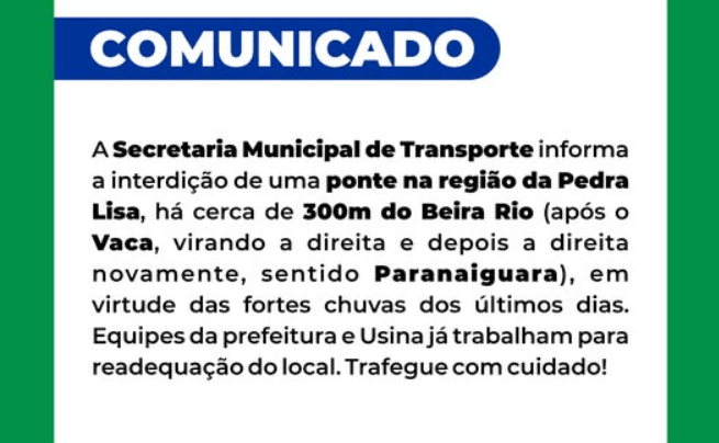Atenção produtores e moradores da região da Pedra Lisa, confira o comunicado da Secretaria Municipal de Transporte. 7 de janeiro de 2025166FacebookTwitterPinterestWhatsApp Relacionadohttps://www.youtube.com/watch?v=puYNnoqI4AE&t=22s