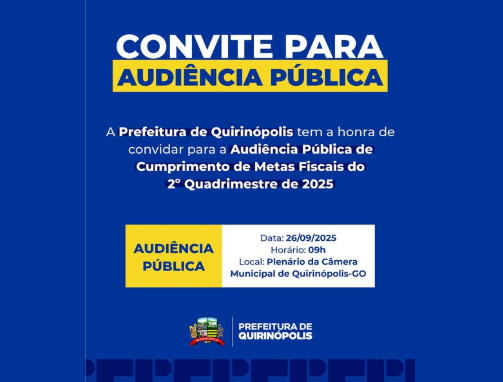 Audiência Pública: Avaliação das Metas Fiscais do 2º Quadrimestre de 2025 24 de setembro de 202511FacebookTwitterPinterestWhatsApp Audiência Pública de Cumprimento de Metas Fiscais do 2º quadrimestre de 2025.Dia 26 de setembro, às 9h, no Plenário da Câmara Municipal de Quirinópolis.Participe! Sua presença é muito importante.Relacionadohttps://www.youtube.com/watch?v=puYNnoqI4AE&t=22s