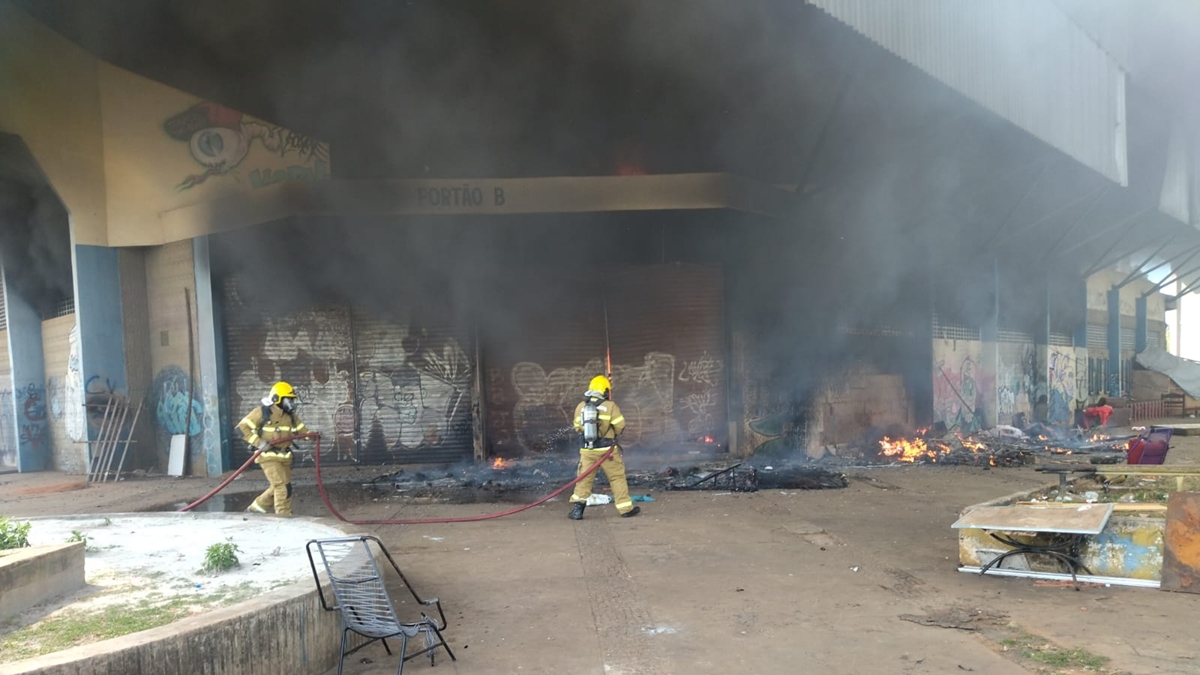 Inicialmente, os bombeiros foram acionados para atender uma ocorrência de princípio de incêndio na parte externa do Ginásio de Esportes. No local, eram queimados materiais como papelão, madeira e lonas. O fogo provocou uma abundância de fumaça e se alastrou, atingindo a área interna da estrutura.