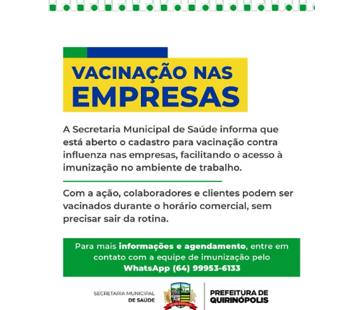 CAMPANHA DE VACINAÇÃO CONTRA INFLUENZA PARA EMPRESAS: IMUNIZAÇÃO PRÁTICA NO LOCAL PARA COLABORADORES E CLIENTES 17 de julho de 202514FacebookTwitterPinterestWhatsApp cadastro para vacinação contra a influenza nas empresas.Mais praticidade para imunizar colaboradores e clientes sem sair da rotina.Informações e agendamentos pelo WhatsApp: (64) 99953-6133.Relacionadohttps://www.youtube.com/watch?v=puYNnoqI4AE&t=22s