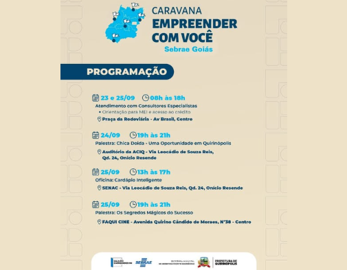 A Caravana Empreender com Você estará em Quirinópolis de 23 a 25 de setembro, trazendo atendimentos, palestras e oficinas. Uma parceria entre o Sebrae Goiás e a Prefeitura de Quirinópolis, por meio da Secretaria Municipal de Desenvolvimento Econômico.
