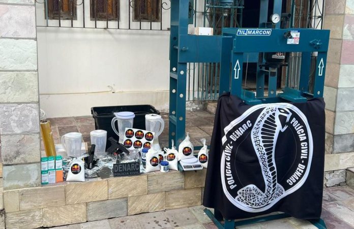 Foram apreendidas duas prensas hidráulicas, duas pistolas semiautomáticas, porções da droga, material para mistura, insumos químicos, além de dois veículos de luxo.