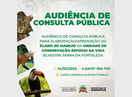A Secretaria Municipal de Meio Ambiente (SEMMA) convida toda população para participarem uma Audiência de Consulta Pública, que ocorrerá no dia 14 de janeiro de 2025, no auditório Joldão Garcia da Silveira a partir das 14h, na sede da Prefeitura Municipal de Quirinópolis.
