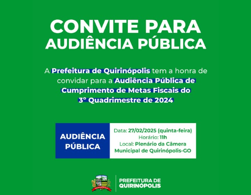 A Prefeitura de Quirinópolis tem a honra de convidar toda a população para participar da Audiência Pública de Cumprimento de Metas Fiscais do 3º Quadrimestre de 2024.