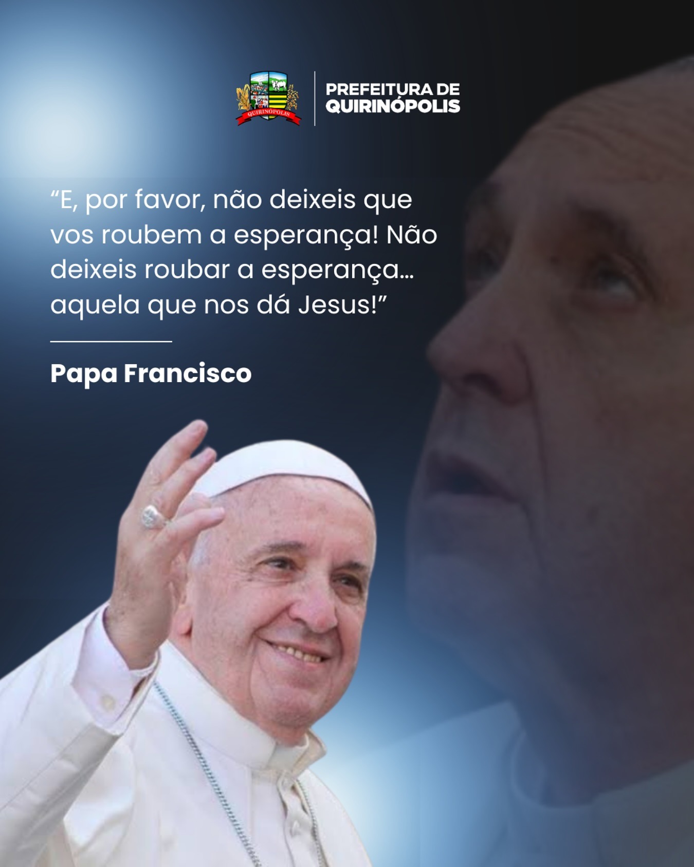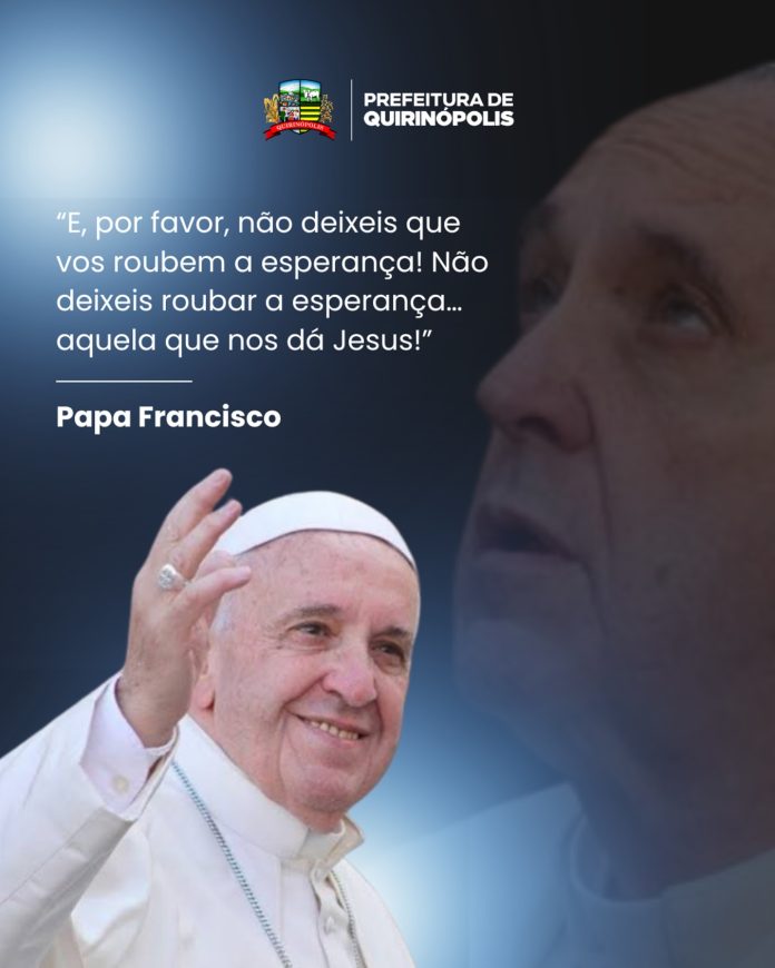 Guiados pela memória e ensinamentos de Papa Francisco, a Prefeitura de Quirinópolis se une ao luto mundial pelo falecimento de Sua Santidade. Líder espiritual que marcou a história com sua humildade, compaixão e dedicação à paz e à justiça social. Que seu legado continue a inspirar o mundo.
