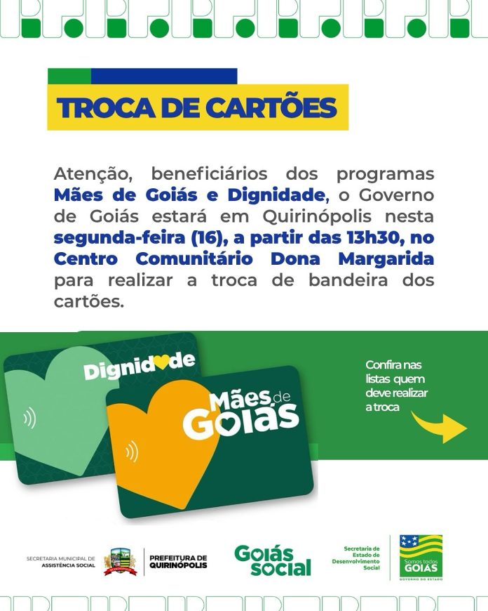Nesta segunda-feira, 16 de junho, o Governo de Goiás estará em Quirinópolis para atender beneficiários dos programas sociais Mães de Goiás e Dignidade. A ação acontecerá a partir das 13h30, no Centro Comunitário Dona Margarida, onde será realizada a troca de bandeira dos cartões utilizados para o recebimento dos benefícios.