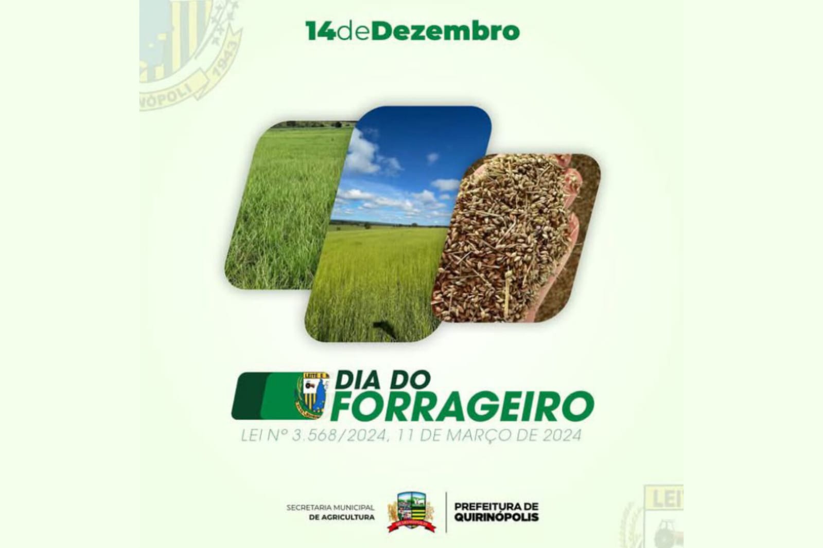 A Lei Municipal Nº 3.568/2024, instituiu o dia 14 de dezembro como o dia do Forrageiro como forma de reconhecimento a esses grandes empreendedores que geram empregos, riquezas e rendas ao nosso município.