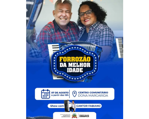 Hoje é dia de forrozão da melhor idade! 7 de agosto de 202525FacebookTwitterPinterestWhatsApp A partir das 18h no Centro Comunitário Dona Margarida.Não fique de fora!Relacionadohttps://www.youtube.com/watch?v=puYNnoqI4AE&t=22s