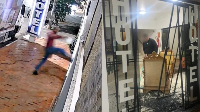 Um homem de 45 anos foi preso suspeito de destruir a entrada de um hotel na cidade de Goianésia. Segundo informações de funcionários do estabelecimento, ele estava à procura da ex-companheira dele, hospedada no local, e toda a ação foi flagrada por câmeras de segurança.