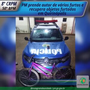 O homem que vinha aterrorizando a população de Quirinópolis com uma onda de furtos foi preso! Na noite de ontem segunda-feira (02), por volta das 23h50, a polícia militar através do 50° BPM, conseguiu capturar o autor no Conjunto Onício Resende. Ele estava com uma bicicleta furtada no Colégio Dr. Onério, no dia 25 de novembro, além de um celular de origem suspeita.