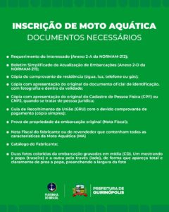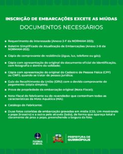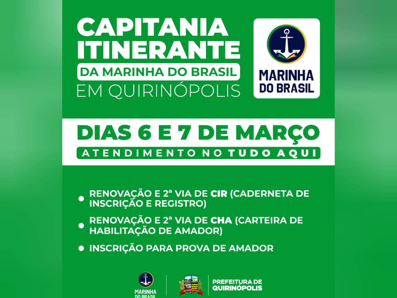 A Capitania Itinerante da Marinha do Brasil estará em Quirinópolis nos dias 06 e 07 de março, com objetivo de regularizar a situação dos pescadores e das embarcações que participarão do Festival de Pesca Esportiva no dia 08 de Marco no Povoado Geraldo Lemos.