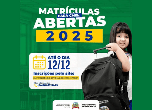 A Prefeitura de Quirinópolis, por meio da Secretaria Municipal de Educação, informa que o período de inscrições para as matrículas nos Centros Municipais de Educação Infantil (CMEIs) para o ano letivo de 2025 segue até o dia 12 de dezembro de 2024.