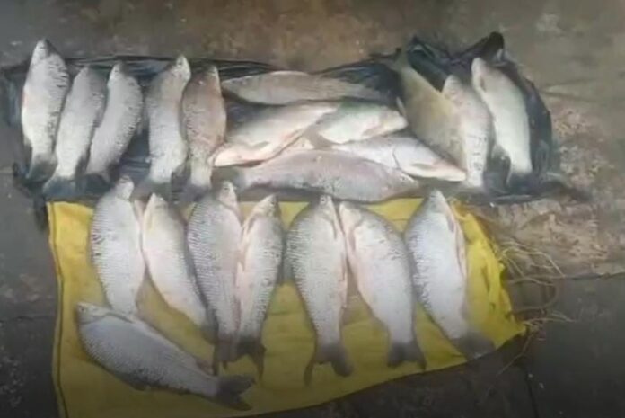 O flagra ocorreu em uma estrada vicinal durante patrulhamento do Batalhão Ambiental da Polícia Militar (PM). Os peixes das espécies curimba e piapara eram transportados em um saco de ráfia.