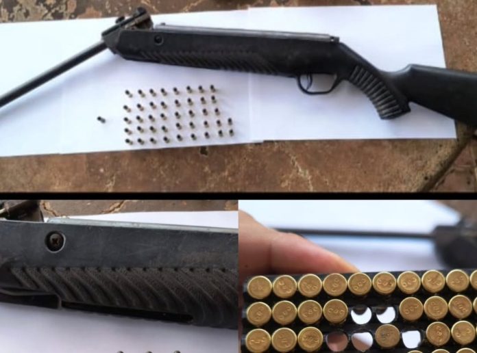 Equipes do 50º Batalhão da Polícia Militar foram até o endereço, mas o suspeito já havia fugido. Durante buscas no imóvel, os policiais localizaram a arma de fogo escondida. Também foram apreendidas 42 munições intactas e uma munição deflagrada.