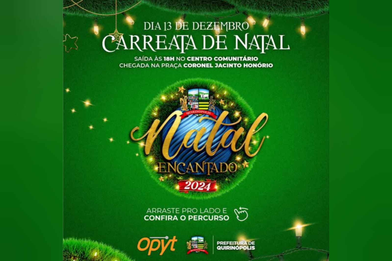 O início das festividades será nesta sexta-feira (13) com uma grande carreata pelas principais ruas da cidade, saindo do Centro Comunitário Dona Margarida as 18h e se encerrando na Praça Coronel Jacinto Honório, onde oficialmente será dado início ao Natal Encantado, que terá programação musical e apresentações todos os finais de semanas, até a virada do ano.