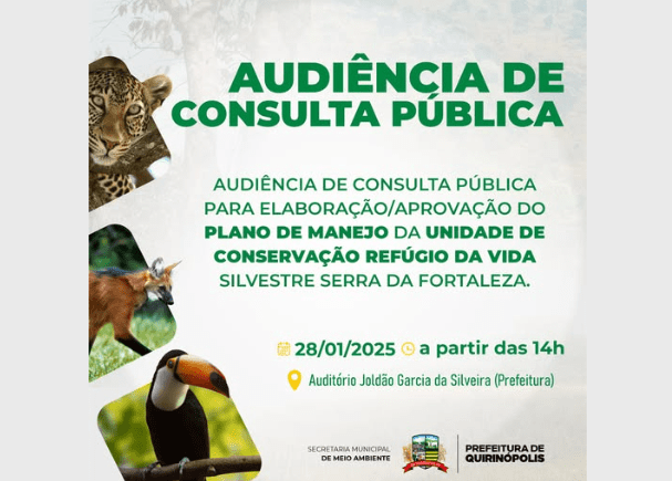 A Secretaria Municipal de Meio Ambiente (SEMMA) convida toda população para participarem uma Audiência de Consulta Pública, que ocorrerá no dia 28 de janeiro de 2025, no auditório Joldão Garcia da Silveira a partir das 14h, na sede da Prefeitura de Quirinópolis. ![]()