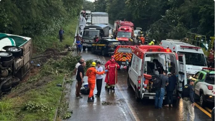 Um ônibus coletivo que seguia de Goiânia com destino a São Félix do Xingu (PA) sofreu uma saída de pista seguida de tombamento na tarde desta segunda-feira (26), por volta das 16h30, na BR-153, em um trecho próximo ao trevo de Interlândia.