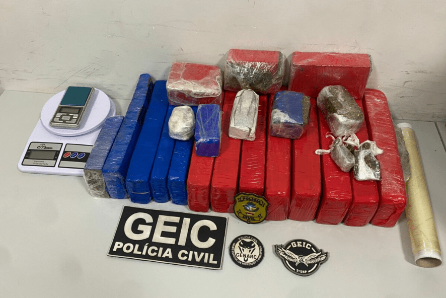 Diante das evidências, a equipe policial procedeu com o adentramento no imóvel, onde foram apreendidos 10 quilos de maconha, balanças de precisão e materiais utilizados para o tráfico. Um homem de 24 anos foi preso em flagrante pelo crime de tráfico de drogas.
