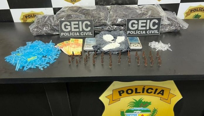 A Polícia Civil de Goiás, por intermédio do Grupo Especial de Investigações Criminais (Geic) de Luziânia – 5ª DRP, deu cumprimento nesta quinta-feira (27) a mandados de busca e apreensão e de prisão temporária em uma residência localizada no Distrito do Jardim Ingá, em Luziânia. No imóvel, os policiais encontraram cocaína tanto “a granel” (pura, para ser misturada), quanto já fracionada em pinos prontos para a venda. Além da droga, havia vasto material para embalagem, confirmando a destinação comercial. O local de armazenagem da droga ficava estrategicamente instalado nas imediações de uma escola, uma igreja e um posto de saúde, fato que agrava a pena do crime (tráfico majorado).