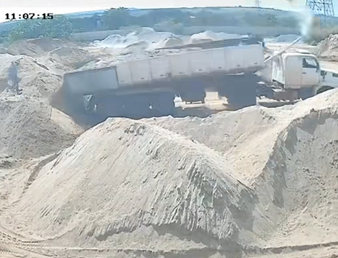 Um acidente de trabalho impressionante foi registrado em um depósito de areia, na manhã do último sábado (31), em Catalão, na região Sudoeste de Goiás. As câmeras de videomonitoramento do local registrou quando o pistão da báscula do veículo quebra e esmaga a cabine durante a descarga de material.