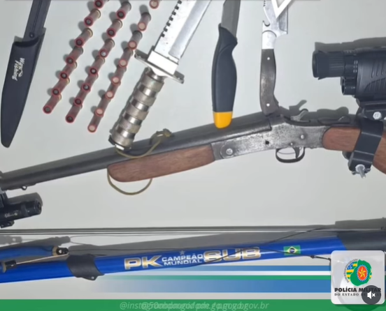 Durante a revista no interior do veículo, os policiais localizaram uma espingarda calibre .36 com acessórios de caça, 23 munições do mesmo calibre, um arbalete (arpão) e três facas. Um dos ocupantes assumiu a posse dos materiais, mas não apresentou documentação da arma nem autorização para porte. Diante do comportamento suspeito, o indivíduo foi algemado, conforme previsto em lei, e recebeu voz de prisão.