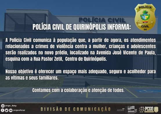 A Polícia Civil de Quirinópolis, Goiás, anunciou que os atendimentos relacionados a crimes de violência contra mulheres, crianças e adolescentes passam a ser realizados em um novo prédio, localizado na Avenida José Vicente de Paula, esquina com a Rua Pastor Zetil, no Centro da cidade.