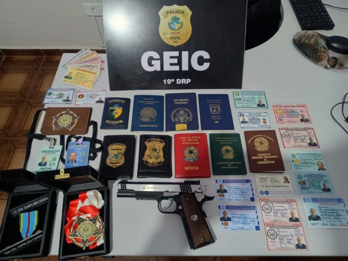 A Polícia Civil de Goiás, por meio do Grupo Especial de Investigações Criminais (Geic) de Caldas Novas – 19ª DRP, efetuou nessa segunda-feira (28) a prisão em flagrante de Roberto Cohen (que também responde como Zigmund Cohen – em suposta nacionalidade Israelense), de 56 anos, suspeito de praticar o crime de falsificação de documentos e símbolos públicos. A investigação identificou que Cohen estabeleceu uma organização social em Caldas Novas. Ocorre que tanto as placas afixadas na sede do estabelecimento, quanto a página da organização na internet, apresentam informações inverídicas e inconsistentes, o que levantou suspeitas de que o indivíduo pudesse estar falsificando documentos e praticando outros delitos conexos. Diante disso, a Polícia Civil representou por busca e apreensão no local, medida deferida pelo Poder Judiciário.