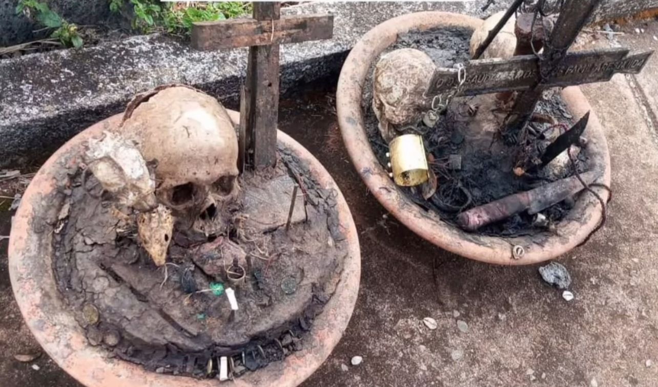 Foram encontrados no local: Crânio humano, ossos de animais, velas negras, ervas e símbolos desconhecidos. Polícia investiga se o crânio foi furtado de algum túmulo.