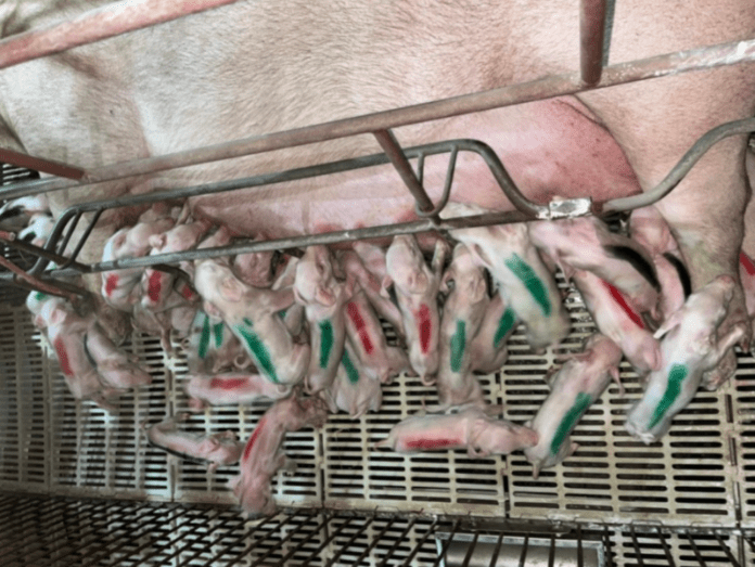 Nas primeiras 24 horas após o nascimento, os leitões recebem colostro, leite rico em anticorpos essenciais para fortalecer o sistema imunológico. Para garantir que todos tenham ingerido colostro, os animais são marcados com tinta atóxica. Quando o número de leitões excede a capacidade da porca, é comum transferi-los para outras fêmeas para assegurar que todos sejam alimentados adequadamente.