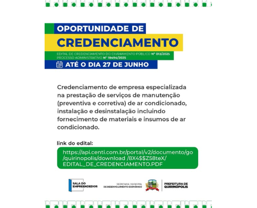 A Prefeitura de Quirinópolis está com credenciamento aberto para empresas especializadas em serviços de manutenção, instalação e desinstalação de ar condicionado, incluindo fornecimento de materiais e insumos.