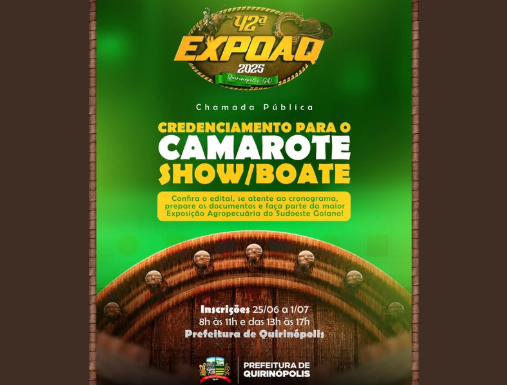 A Prefeitura de Quirinópolis lançou o Edital de Chamamento Público nº 014/2025, abrindo oficialmente o credenciamento para exploração do camarote show/boate na aguardada 42ª Festa de Exposição Agropecuária de Quirinópolis (EXPOAQ), que ocorrerá entre os dias 23 e 27 de julho no Parque de Exposições João de Oliveira Gouveia.
