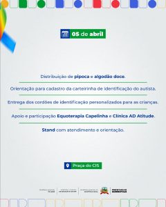 Todas as atividades ocorrerão na Praça do CIS, aberta ao público, com o intuito de fomentar a conscientização e inclusão de pessoas com autismo, além de promover momentos de aprendizado e interação entre a comunidade. Além disso, durante todo o dia haverá entrega dos cordões de identificação, orientação sobre cadastro para a carteirinha de identificação e distribuição de pipoca e algodão doce.