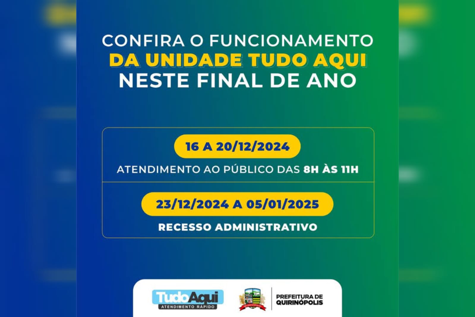 QUIRINÓPOLIS- Confira como ficará o atendimento na unidade Tudo Aqui neste final de ano! ✅ 13 de dezembro de 2024154FacebookTwitterPinterestWhatsApp Relacionadohttps://www.youtube.com/watch?v=puYNnoqI4AE&t=22s