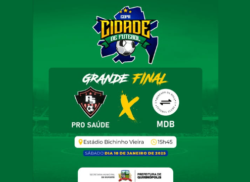 A prefeitura de Quirinópolis, por meio da Secretaria de Esportes, tem o prazer de convidar você e sua família para prestigiar a grande final da Copa Cidade de Futebol Amador!