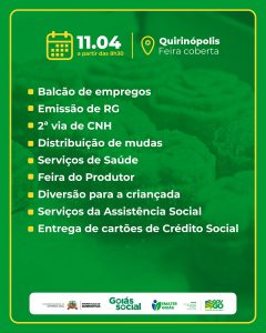 QUIRINÓPOLIS- Ta chegando! 10 de abril de 202527FacebookTwitterPinterestWhatsApp O Agro é Social vai trazer para Quirinópolis uma série de serviços públicos gratuitos. E, a partir de amanhã, 10, os atendimentos já começam na Feira Coberta Esperamos por vocês Relacionadohttps://www.youtube.com/watch?v=puYNnoqI4AE&t=22s